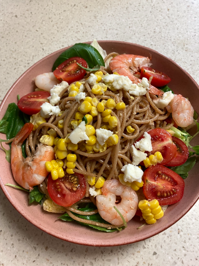식힌 파스타면을 소스와 섞어 넣고 방울토마토, 새우, 치즈 ,콘샐러드 장식 하고 통후추 갈갈